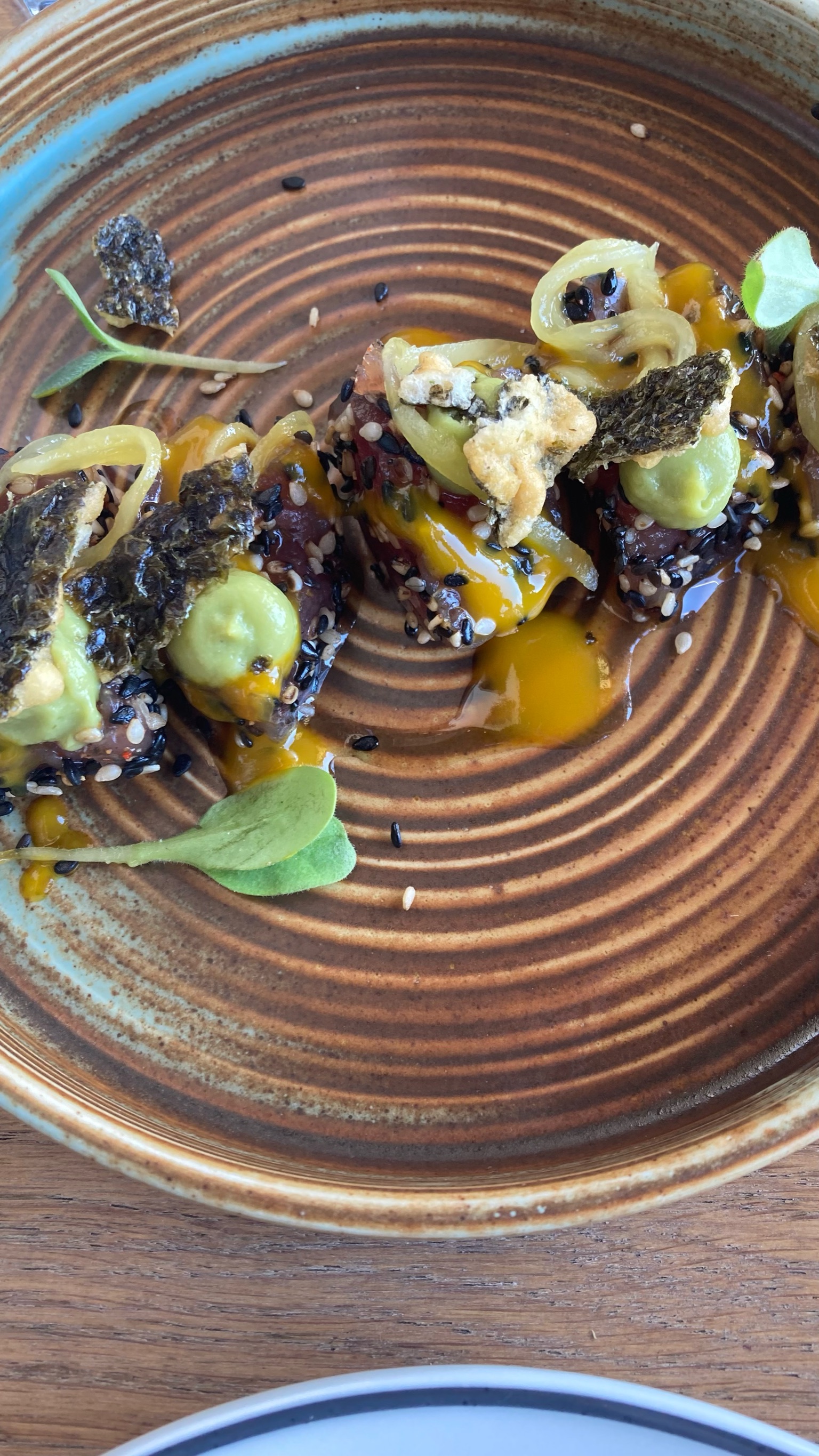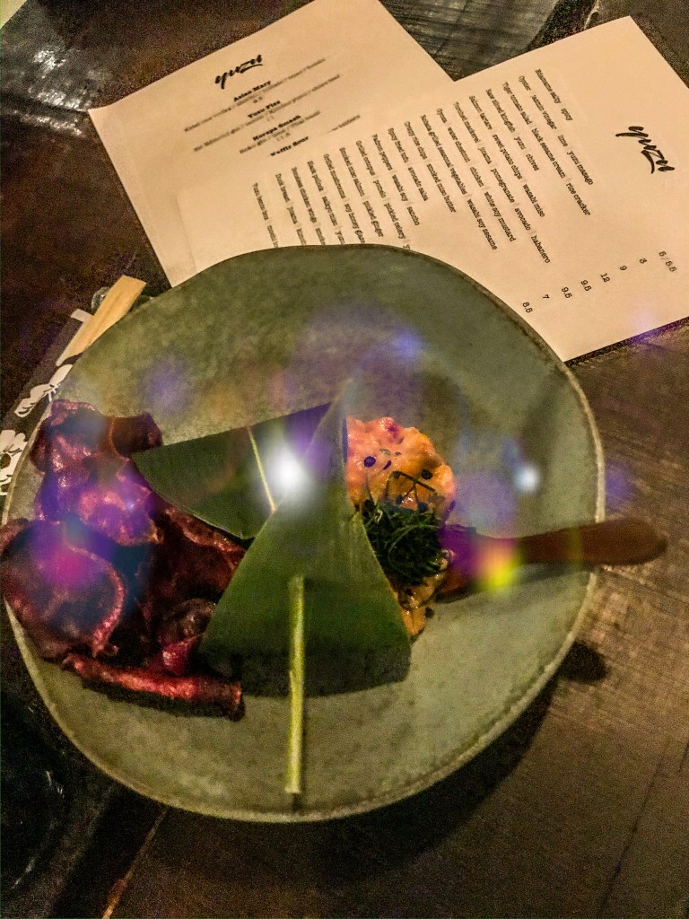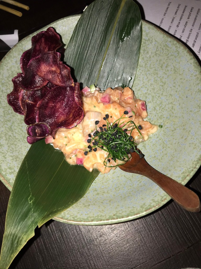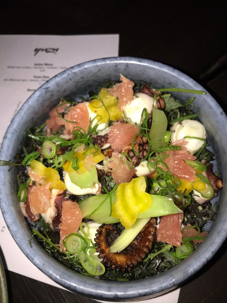 De menukaart bestaat uit kleine Aziatische gerechtjes die je kunt delen, de meeste gerechten zijn afkomstig uit de Japanse keuken. Wij hadden de salade met gegrilde octopus, grapefruit en citrus-sojadressing, echt heerlijk, en ook de zalmtartaar met zoete aardappelchips is aan te raden. Yuzu is mijn nieuwe favoriete borrel hotspot in Den Haag! Neem je portemonnee wel mee want goedkoop is het zeker niet..