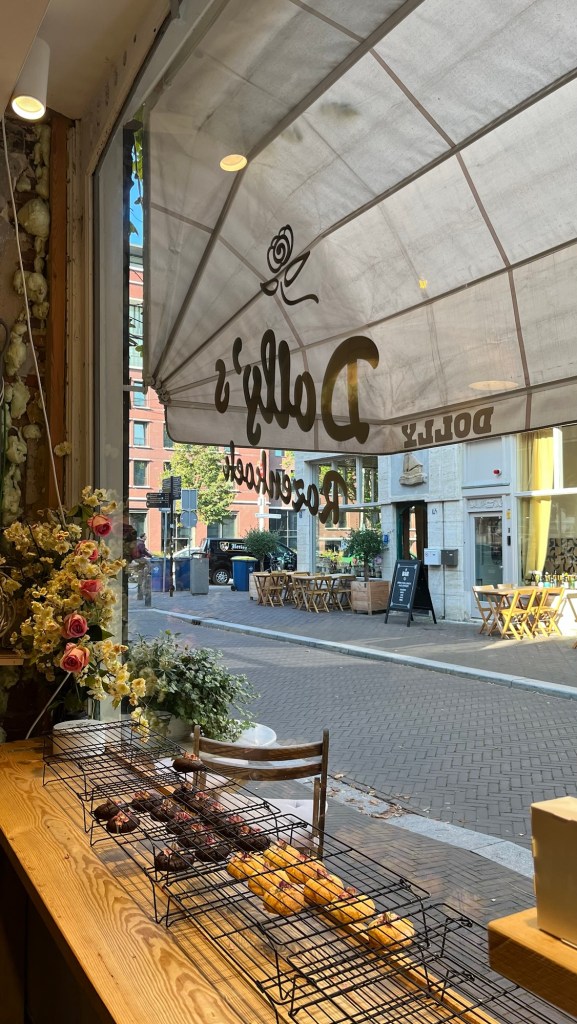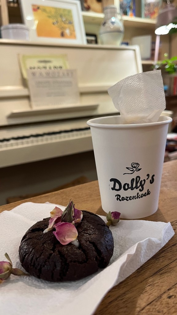 Dit vind ik toch wel zo’n leuk zaakje: Dolly’s Rozenkoek! Ik word helemaal blij als ik hier ben. Vooral ook omdat je ook plaats kunt nemen in deze leuke zaak. Op de heerlijke koekjes zitten rozenblaadjes . Deze zijn dan ook nog eens gezond! Helaas is dat wel het enige wat gezond is aan het koekje, maar zondigen op zijn tijd mag heus wel.